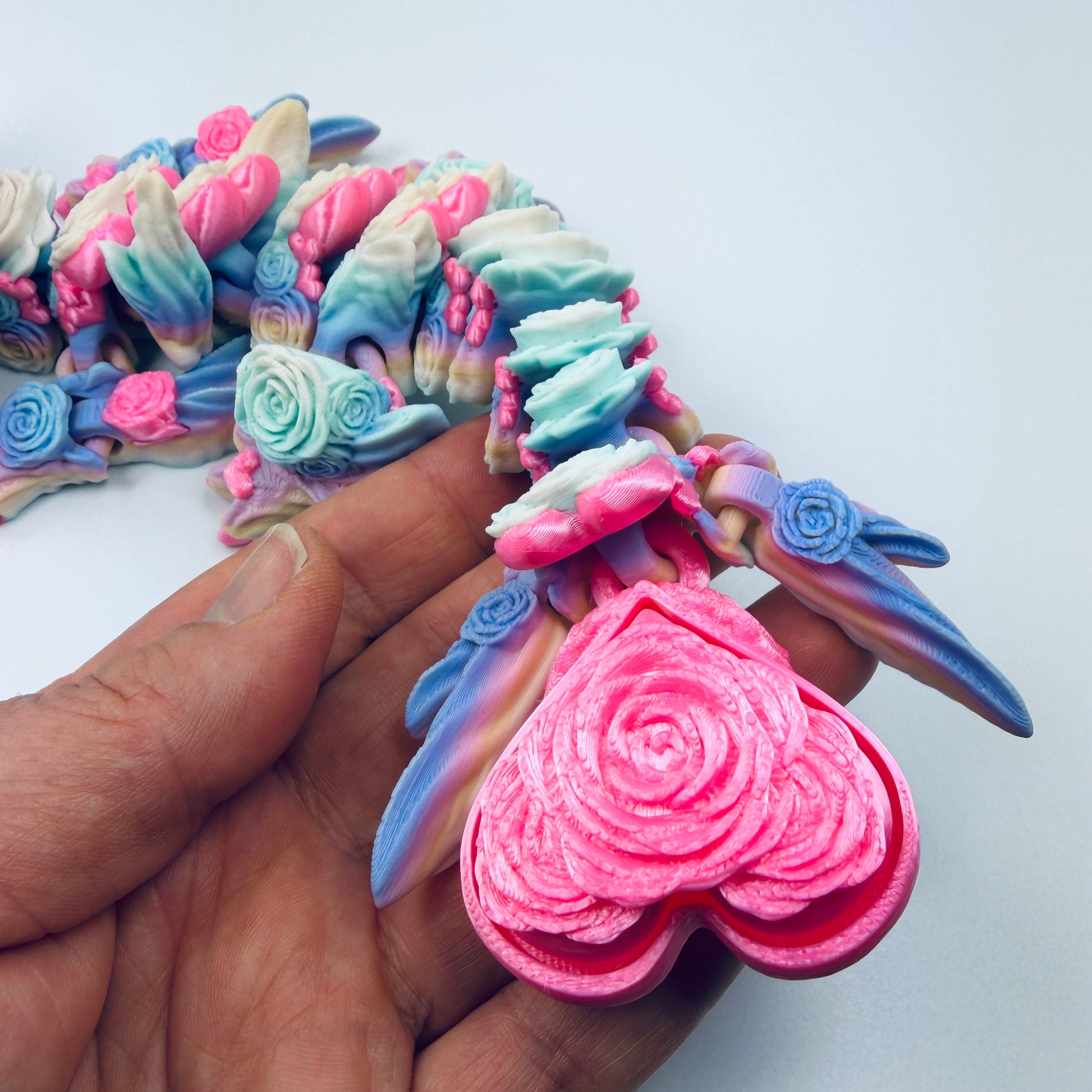 Meet your new floral companion! This adorable baby dragon features delicate rose and heart details that are impossible to resist. The interactive clicker tail adds a playful twist - perfect for fidgeting, collecting, or gifting to dragon enthusiasts of all ages. Soft, detailed, and utterly enchanting, this little beauty brings a touch of fantasy magic to your day. Whether you're a seasoned collector or discovering dragons for the first time, this rose-hearted cutie is sure to become a treasured favourite.