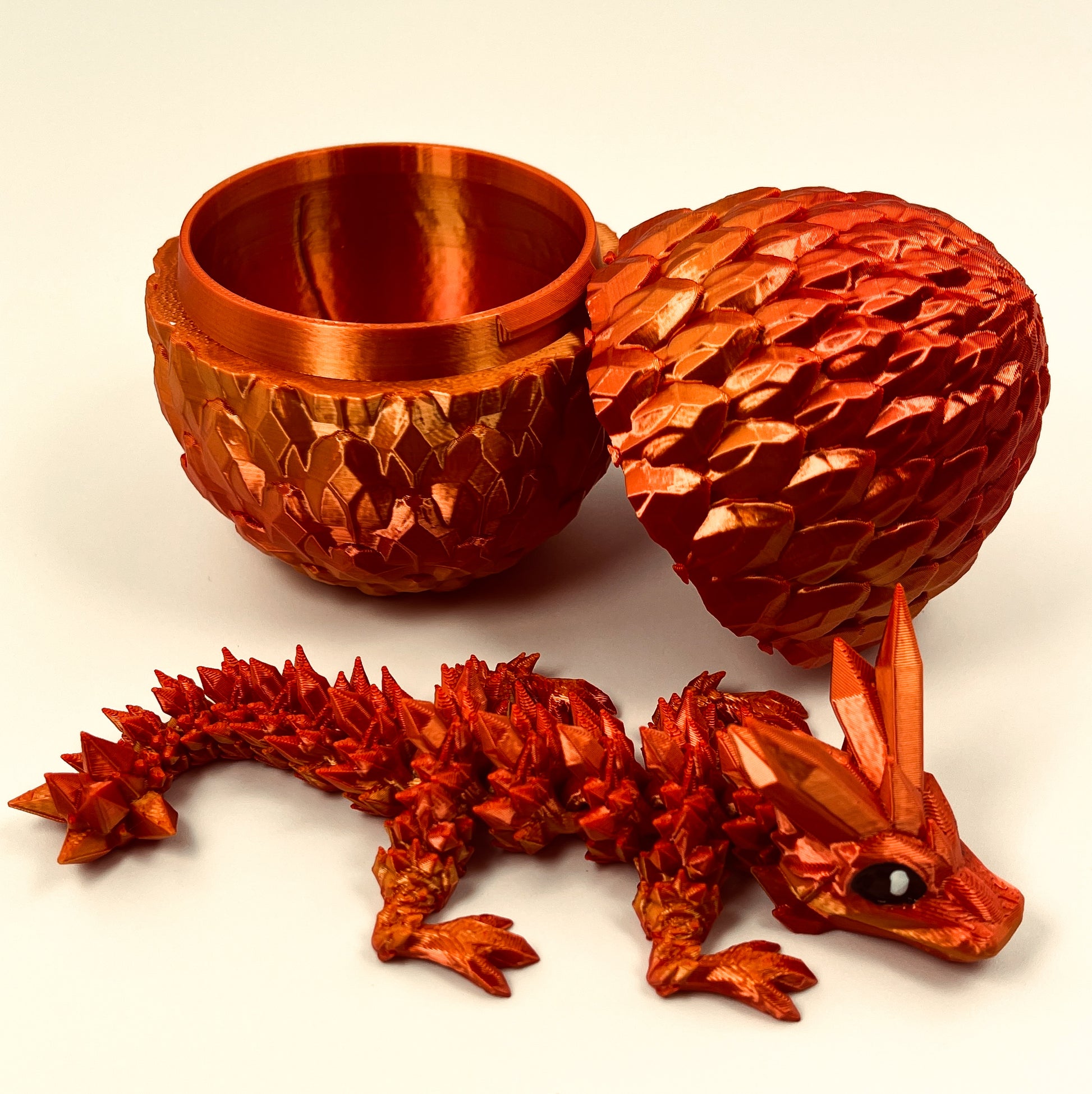 Each 3d printed dragon egg features intricately detailed scales, can screw closed, and contains one matching coloured 3d printed dragon (actual size depends on your selection). The teeny tiny dragons are wee Winter dragons, as these are the strongest for this size.