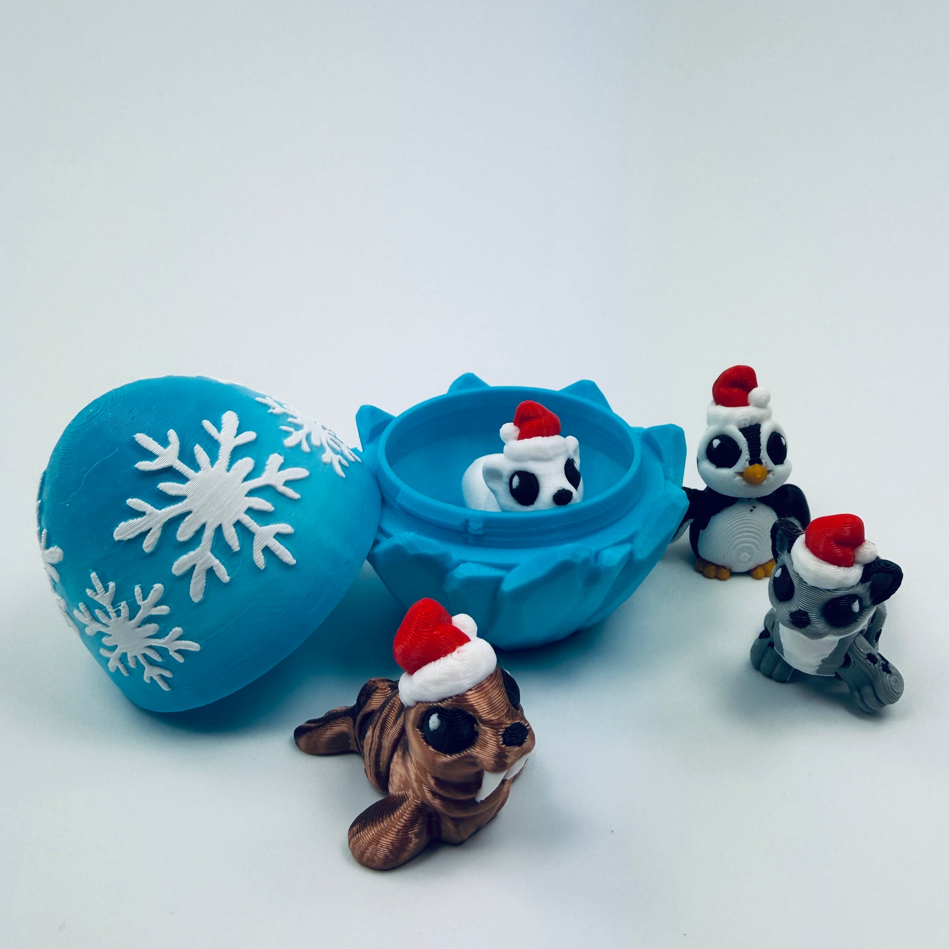 Crack open the 3d printed winter dragon egg and see what's inside! This combo deal is for one limited edition winter egg and 3 teeny tiny Santa creatures - these will be randomly selected, however if you have a special request please leave a note with your order and we will do our best to accommodate.