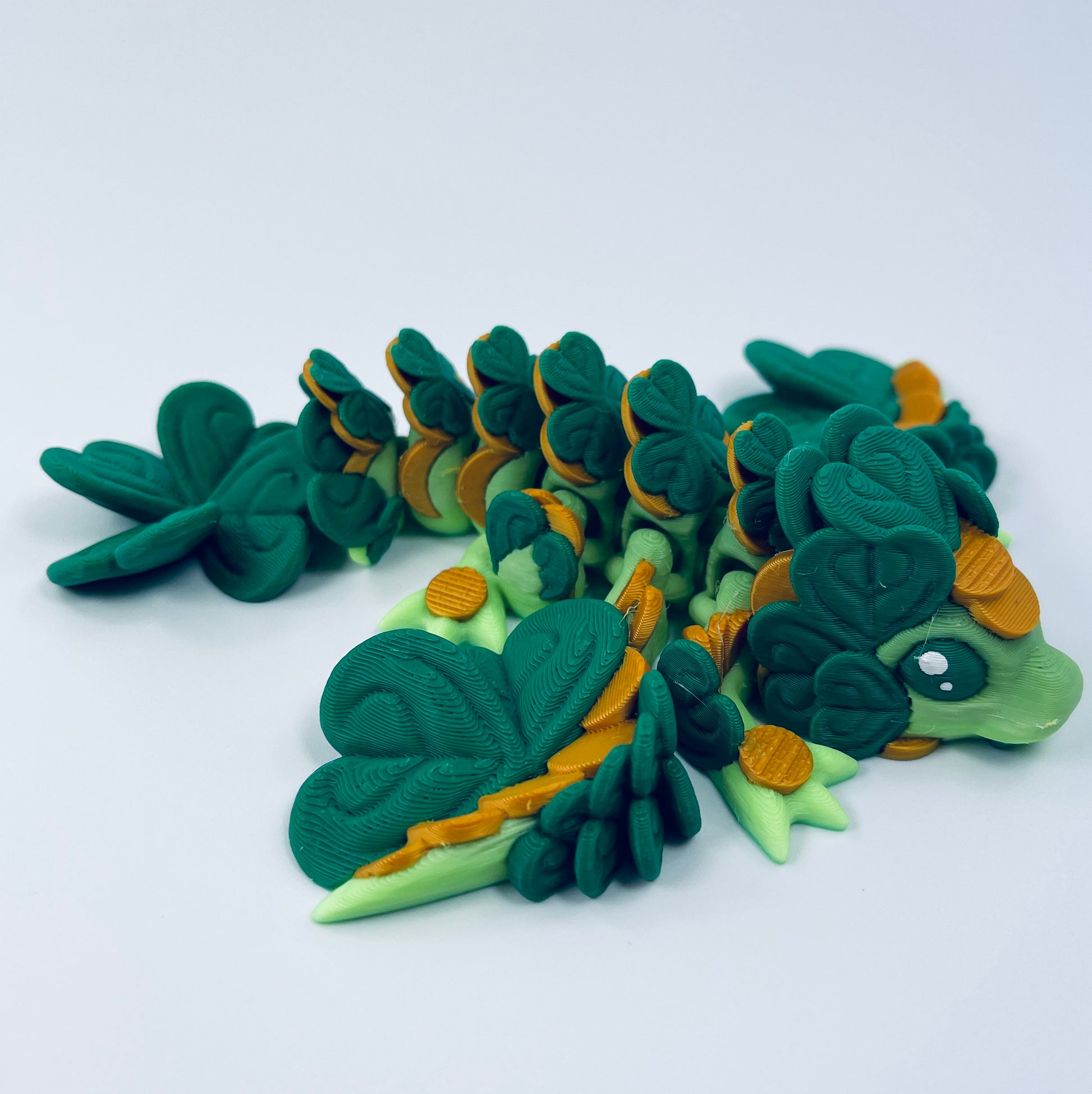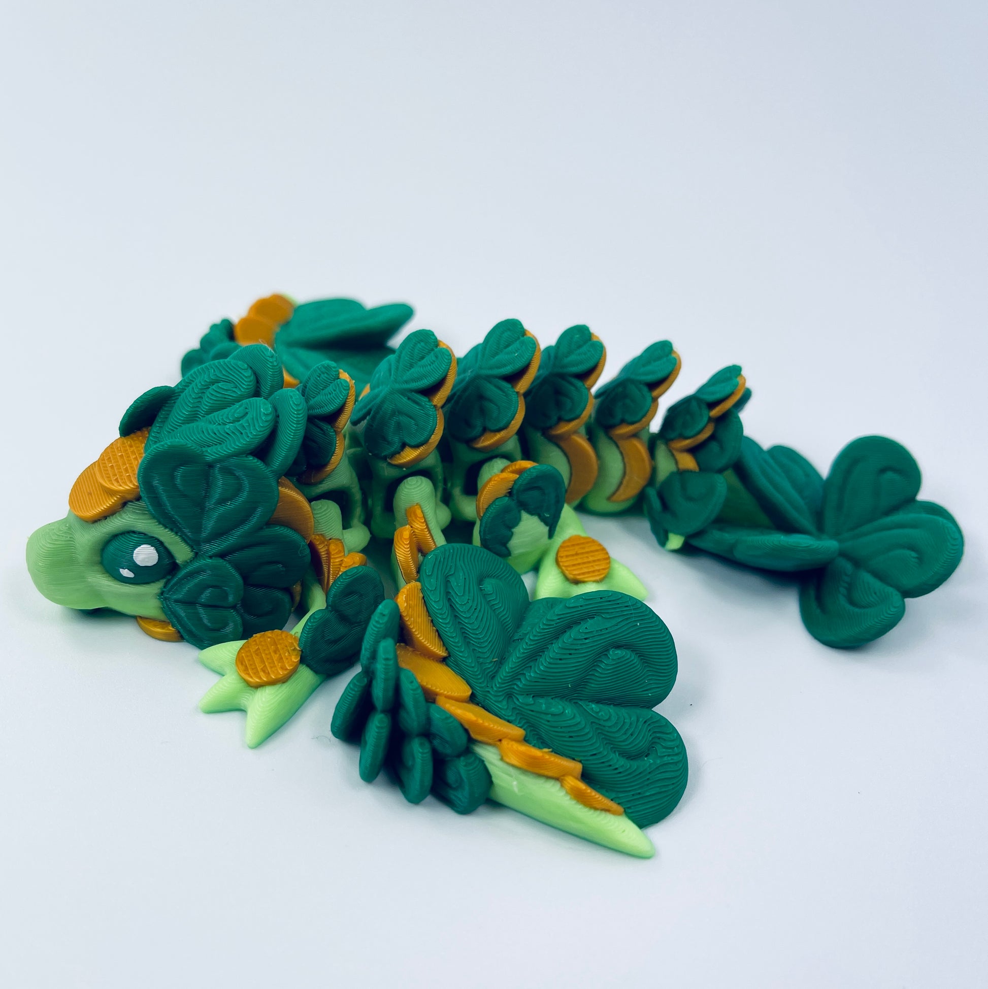 Lucky clover dragons eagerly yearn to accompany you, bestowing upon you an abundance of good fortune and pure delight. This tiny Clover dragon is printed with 3 colours, the lighter green is a gradient filament which means your dragon may appear slightly different to the one which is shown in the photo - each one is slightly unique!