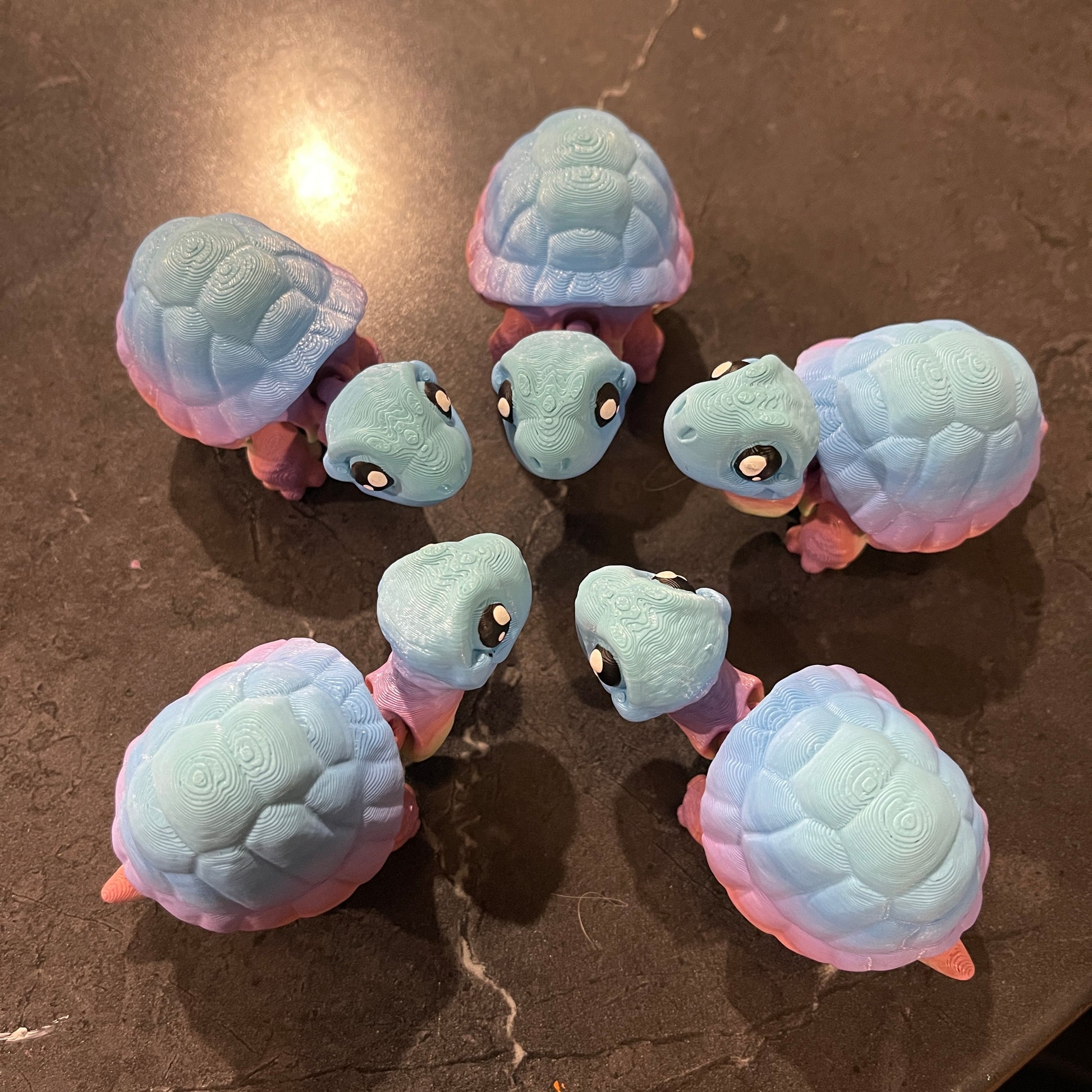 What makes these 3d printed tortoises truly unique is their movable parts, their head, tail and legs can tuck up inside their shell (regular size only), allowing you to pose them in any delightful manner that captures your imagination.