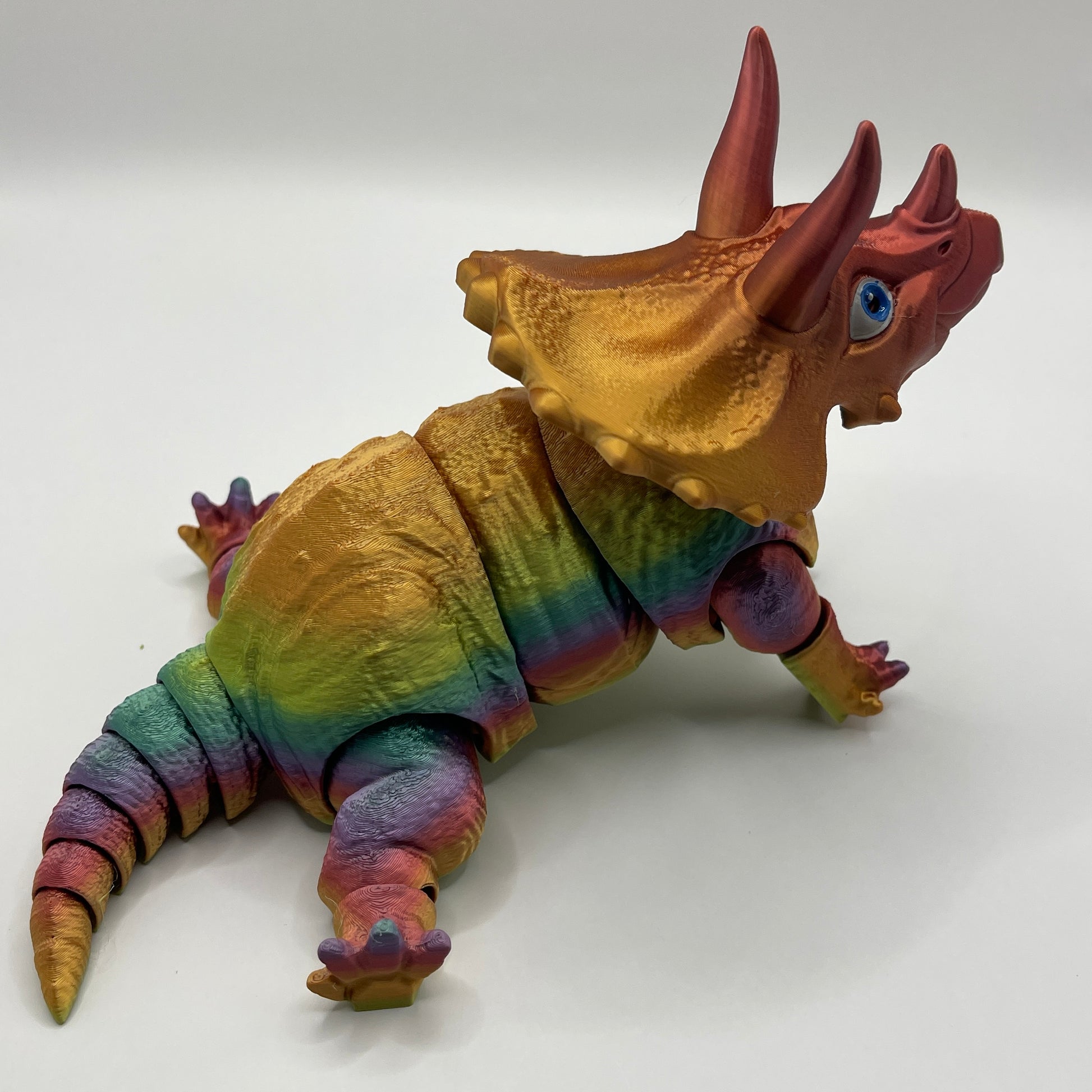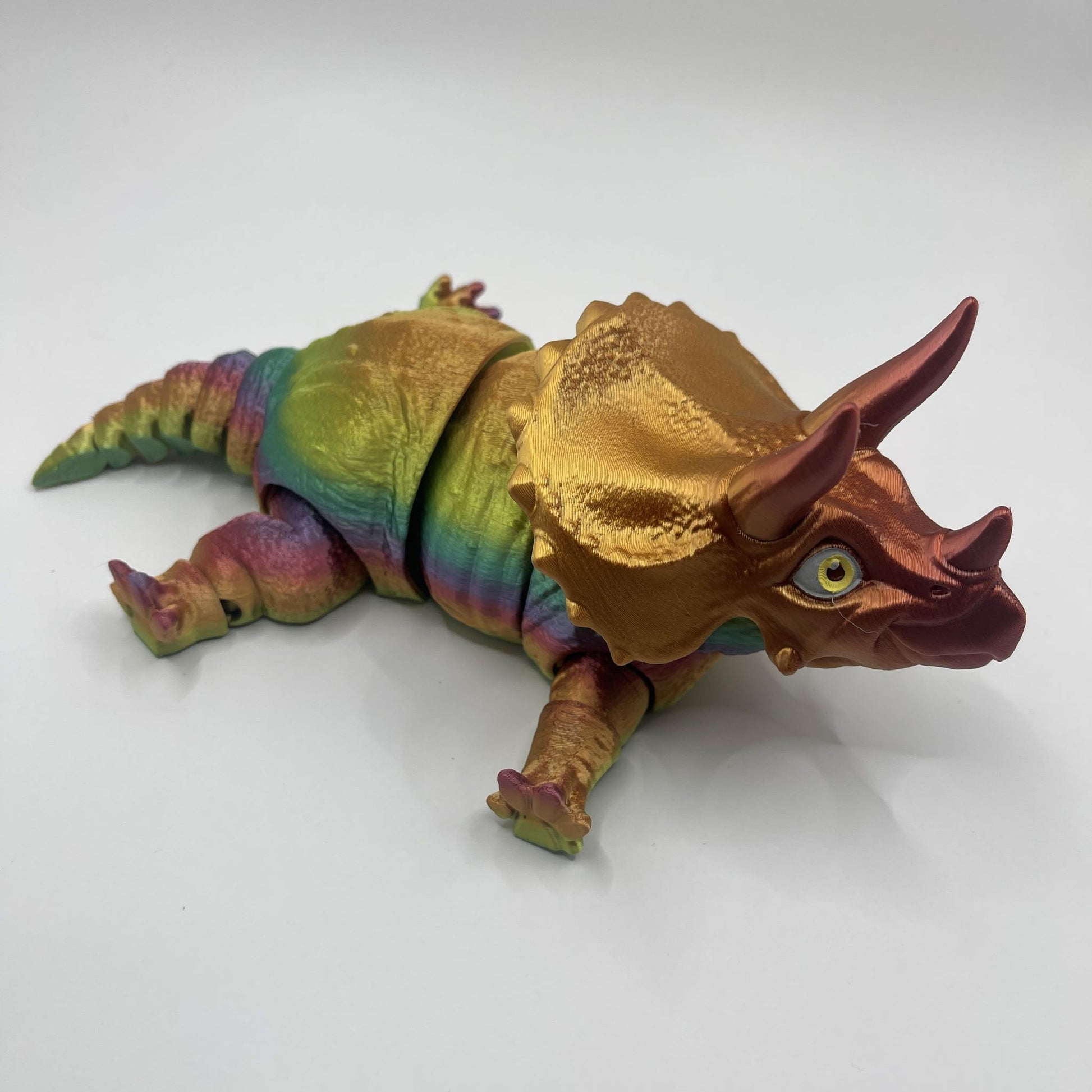 Not only are these creatures adorable, but they are also environmentally conscious. Crafted through 3D printing using sustainable and organic materials, this Triceratops provides a guilt-free purchase that aligns with your eco-friendly values. Each one is carefully inspected, and has its eyes hand painted before leaving on its journey to its new home.